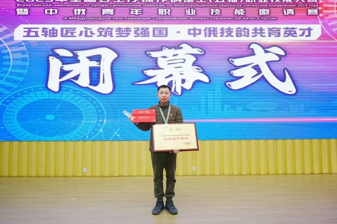 本次赛事紧扣人才强国战略部署,聚焦高端装备制造核心技术,以五轴联动加工技术为竞赛核心,吸引了来自全国32个省市自治区的82名选手及俄罗斯10名选手同台竞技。经过五天的激烈比拼,李殿伟凭借扎实的专业功底、精湛的操作技艺与稳定的临场发挥,在强手如林的赛场中展现出过硬的综合素养,既彰显了个人精湛技艺,更印证了十一院在高技能人才培养领域的扎实成效。